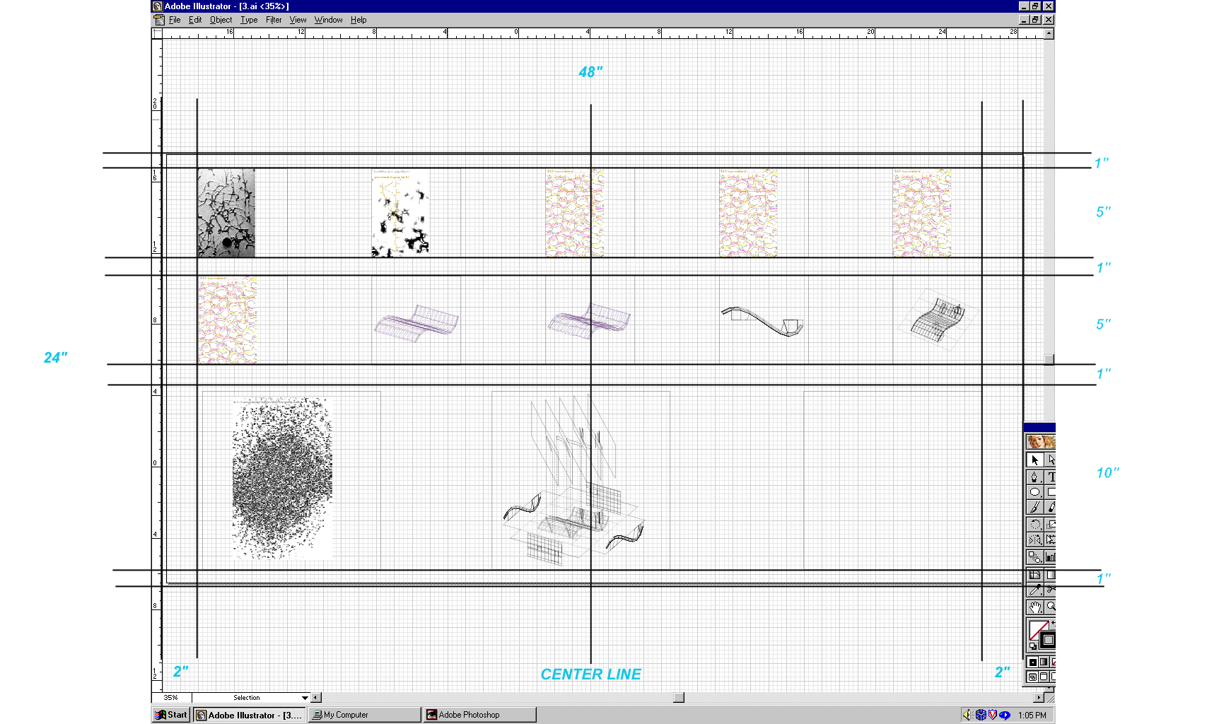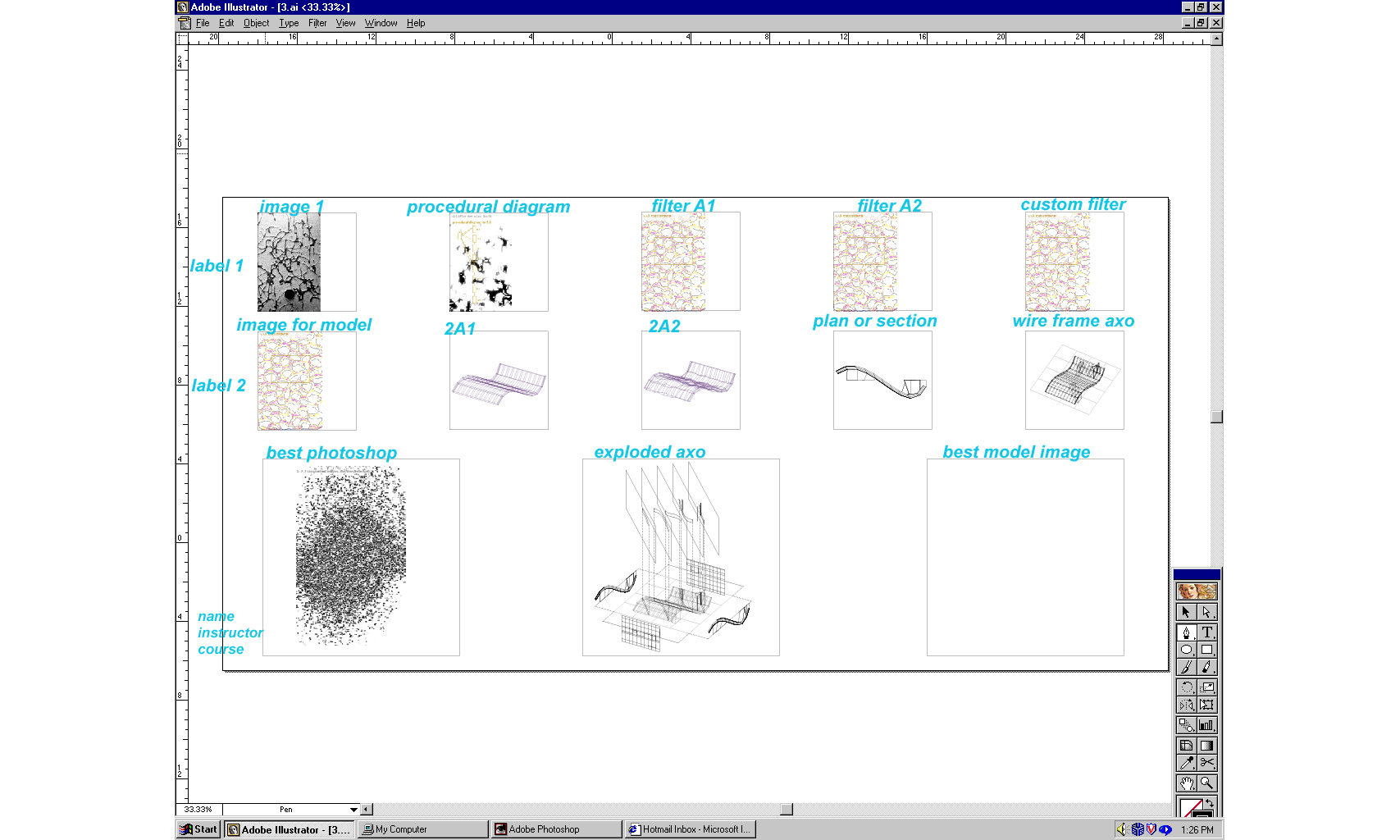 Each student must lay out a 24"x48" landscape format Illustrator document containing their work over the course of the quarter. This will include final work from each exercise you have completed and will be the primary source for grading your work. Save form Z drawings as Illustrator documents. Copy and paste the drawings into your final document ensuring that you retain appropriate line weights and scale. Save all photoshop work as TIFF images at a minimum of 150 dpi relative to the printed scale.