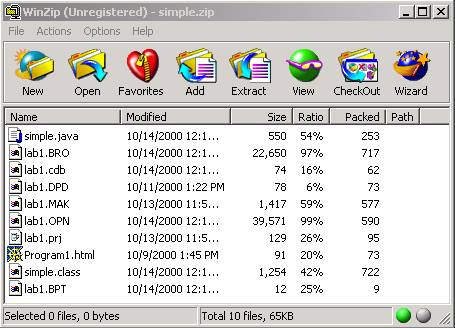 WinZip is an application that compresses a series of files and/or folders into a single file with .zip extension. To zip a set of files, put them in a folder and then zip the folder. The application winZip looks like this: