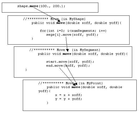 The structure of these classes works as follows: when a method is called at the top, thata method calls its corresponding method of the calss right below all the way to the bottom classes that do the job. For example, a call to shape.move(x, y) will call the (in a loop) the MySegment’s method “move”, which in turn will call the MyPoint’s method “move” which will do the actual movement.
