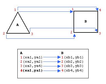 The above formula would work fine if the parents and child had the same number of points. But that is not necessarily always the case. For example, what if we want to average the points of a 3-point object such as a triangle and a 4-point object such as a square. We would have to find a way to map the two polygons, or in general, a way to map the number 3 to the number 4. Here is what we do (and this is one of the many way to do the mapping): we first create a child object that has the same number of points as the biggest parent, that is, the parent with the most points. So in the above case, the child would have 4 points. Then we map the first three points of the parents one to one and the last extra point of the one parent is mapped to a copy of the last point of the other parent. This is shown in the diagram below: