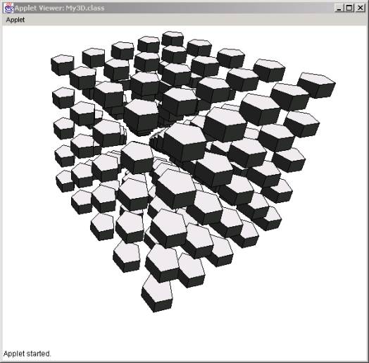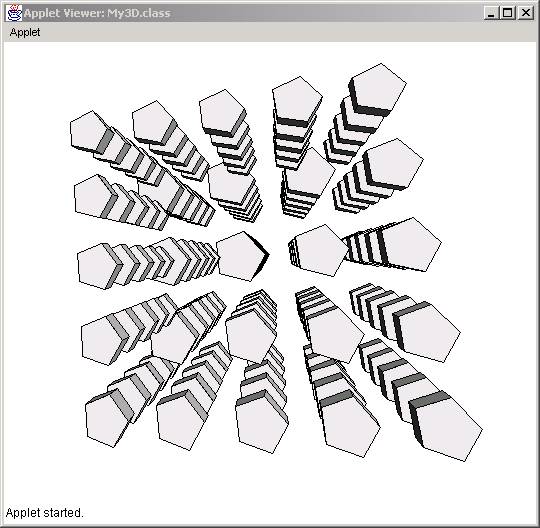 Finally, we loop three times in x, y, and z directions using three counters xk, yk, and zk. Inside the loop, we first create a set of points (points[]) which we populate with the points created through the face constructor earlier (see above). Once the set of points is populated, we create the MySolid and we move it in a 3D grid in space 60 units apart: